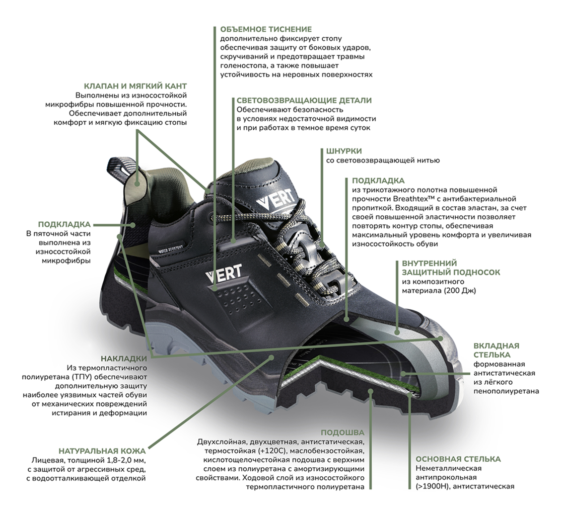 Обувь серии VERT 3000 - безупречное сочетание стиля, комфорта и передовых технологий! Надежная защита от агрессивных сред, механических воздействий в любое время года позволяет обеспечить безопасность сотрудникам самых различных отраслях промышленности.