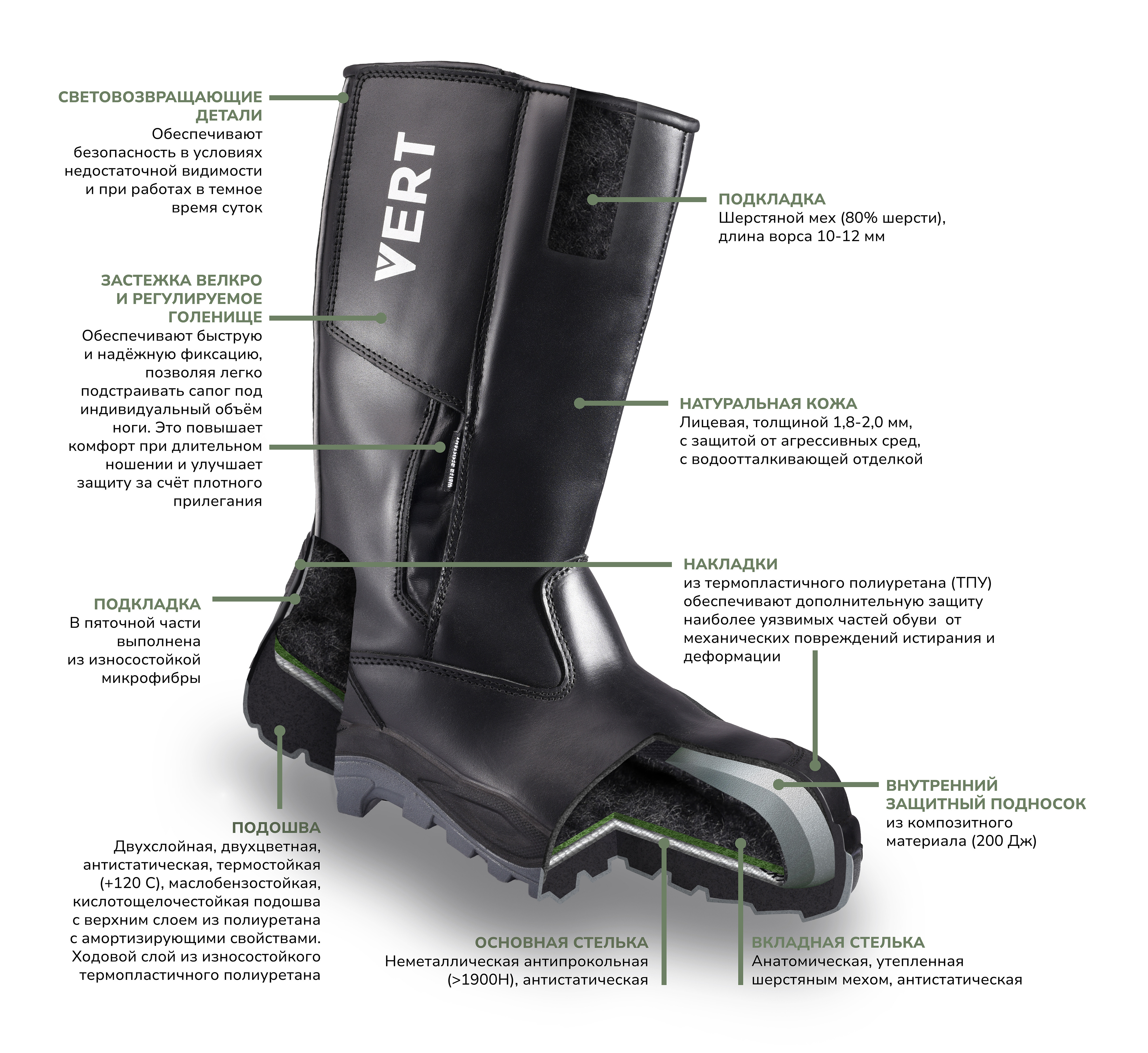 Сфера применения (назначение): защита ног при выполнении технологических операций с технологическим оборудованием и инструментом в зимний период времени. Снижение риска искрообразования. Для прохождения через металлодетекторы. Рекомендуется для нефтегазовой, химической, металлургической отраслей, а также в машиностроении, логистике, производстве, строительстве, автосервисе и других сфер, где важны максимальная защита, легкость и комфорт.