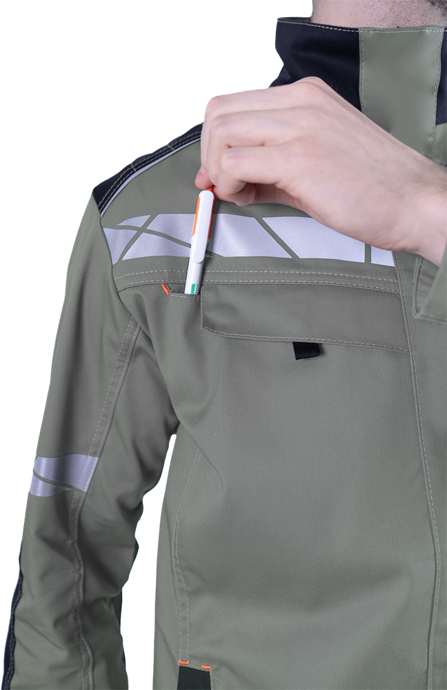 • по кокетке спинки, плечевой вставки полочки, в нагрудном вертикальном кармане кант из двухсторонней световозвращающей полосы