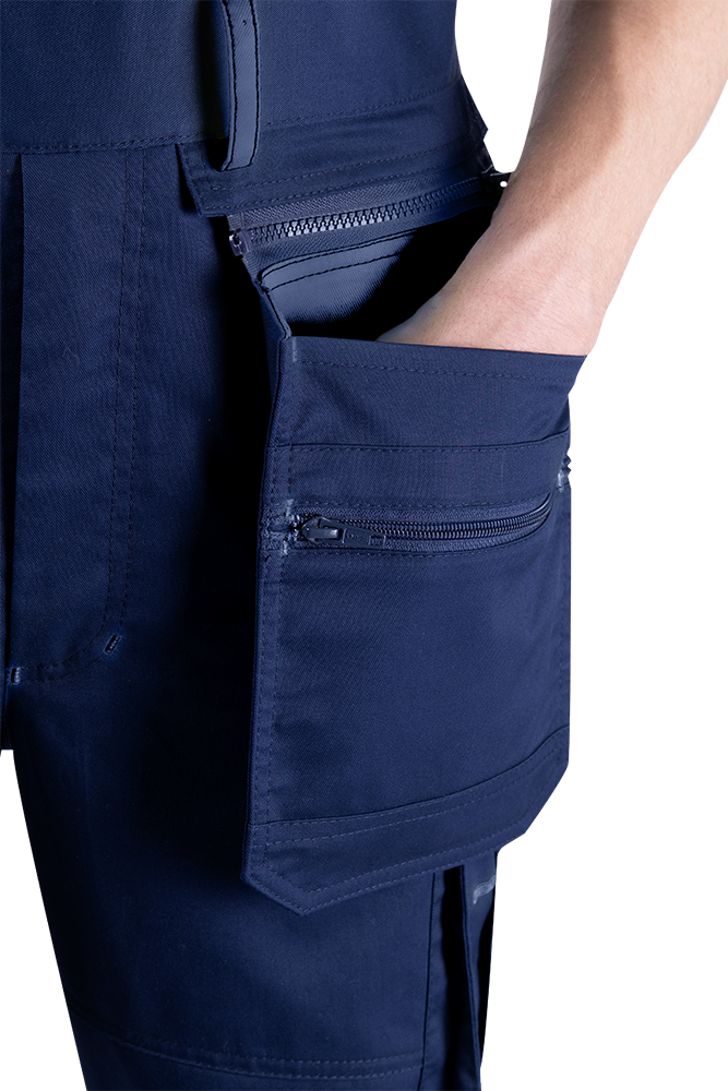 Дополнительный объёмный нагрудный карман и большое количество удобных карманов по бокам позволяют всегда держать под рукой необходимые инструменты и личные вещи. Усиленные наколенники с возможностью установки амортизационных вкладок делают полукомбинезон оптимальным для работы в коленоположении.