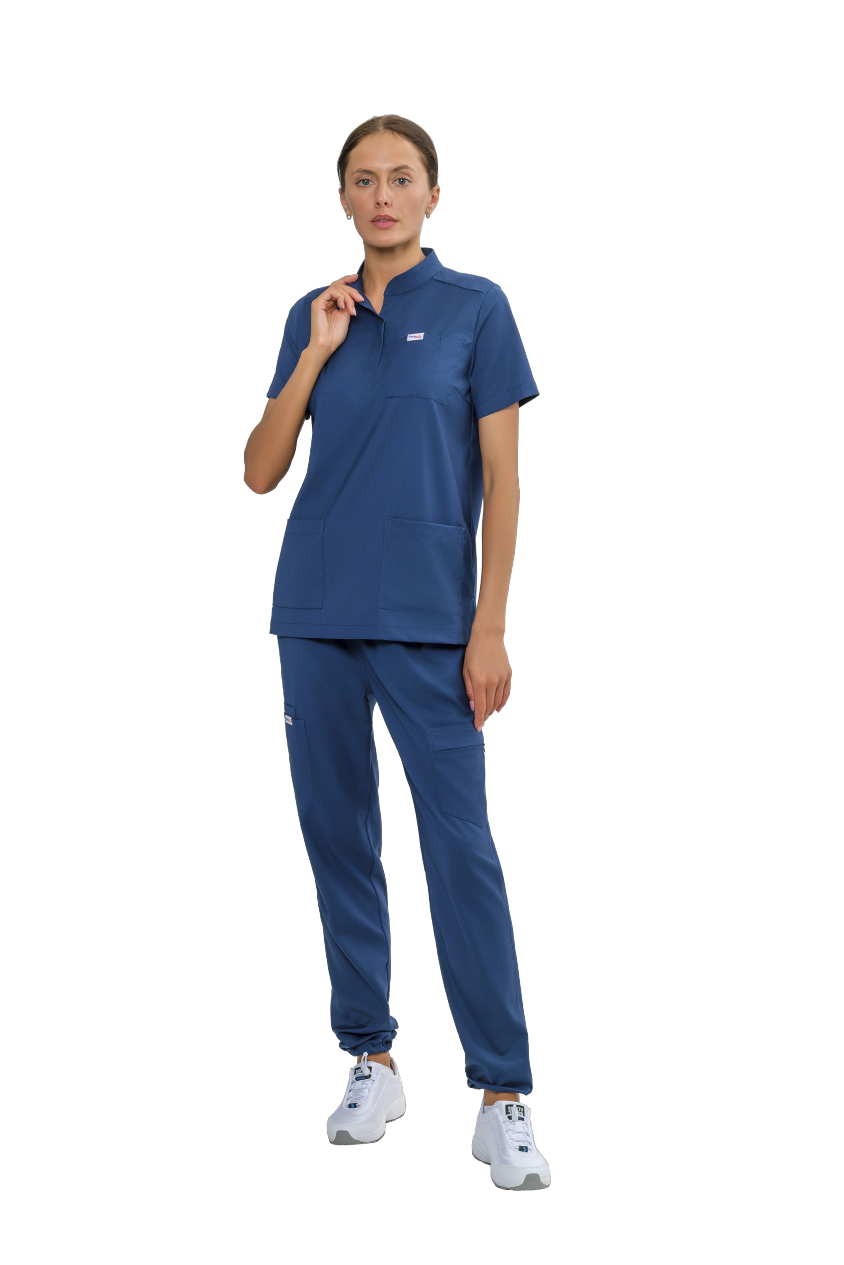 На уровне боковых швов расположены 3 накладных кармана: левый -накладной карман фигурной формы вход в карман с застежкой-молния, правый -большой накладной карман фигурной формы и малый накладной карман расположен под правым большим карманом, вход в карман разделенный на две секции.