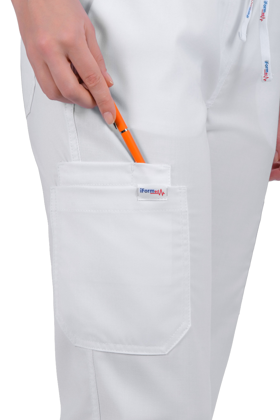 Брюки зауженные к низу, с поясом с лентой эластичной со шнуром, с 7 карманами.